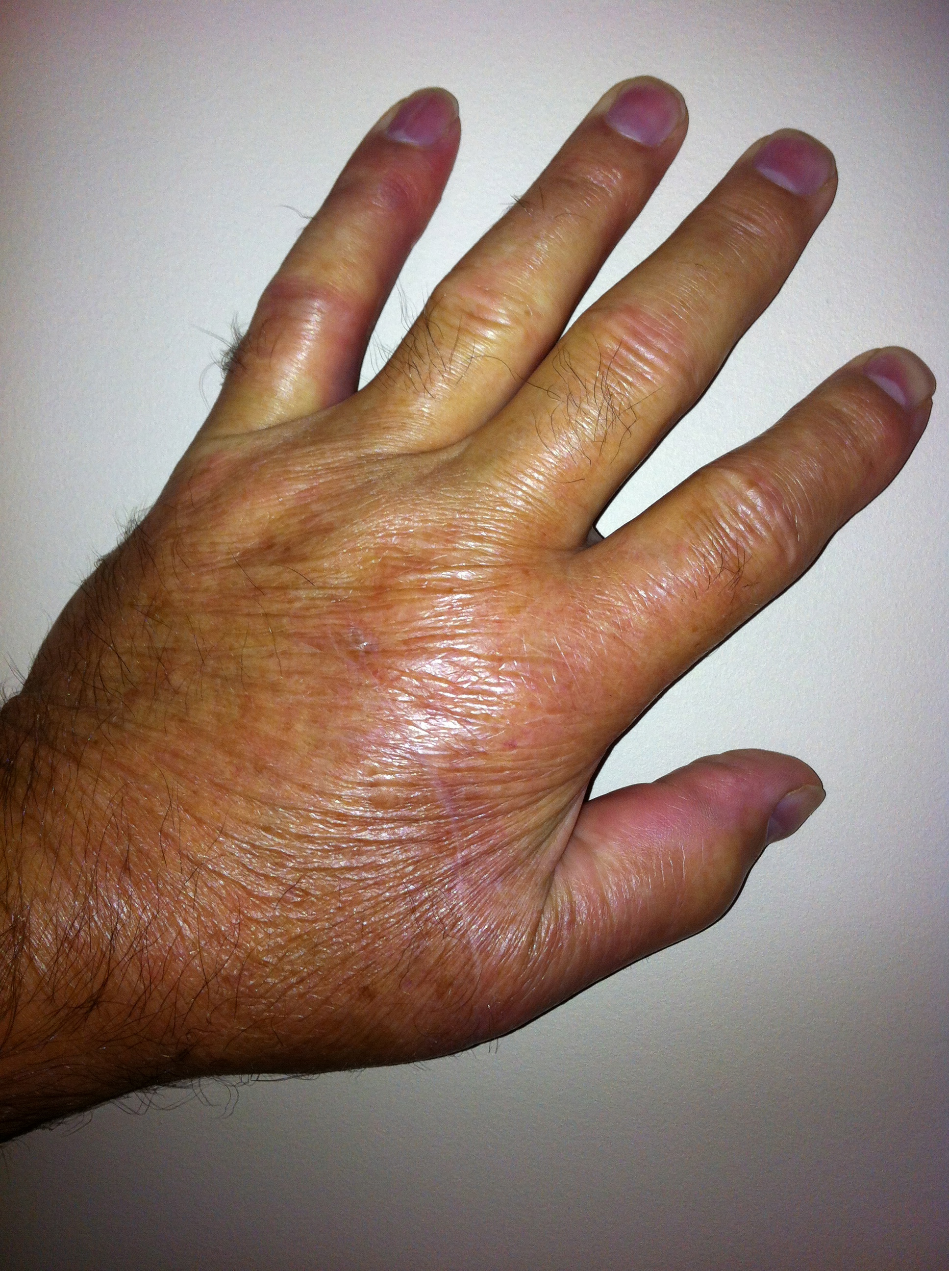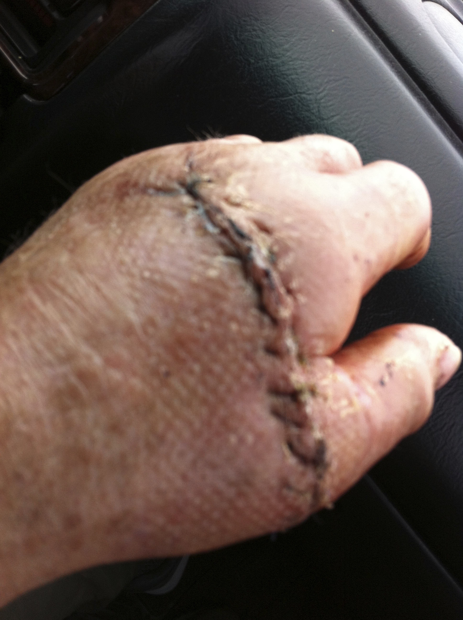 My hand was cupped one way; the blade is curved the other way. The combination of opposite curves made for an extra-deep cut into the back of my hand, just above the knuckles, through skin, tendons, bones, flesh and muscle. Yeah, ugly!